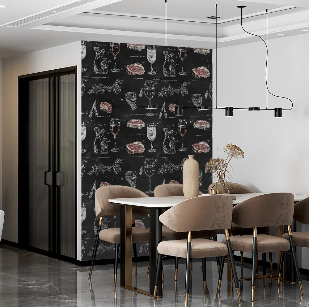 Фототапети за заведения – Вино, месо и гурме стил са отличен избор за ресторанти, кафенета, бистра и барове, които искат да създадат топла и автентична атмосфера. Дизайнът в стил chalkboard с изрисувани чаши вино, стекове и подправки придава кулинарен характер и усещане за уют. Подходящ е както за интериор на заведение, така и за декоративна стена в кухня или винен кът.