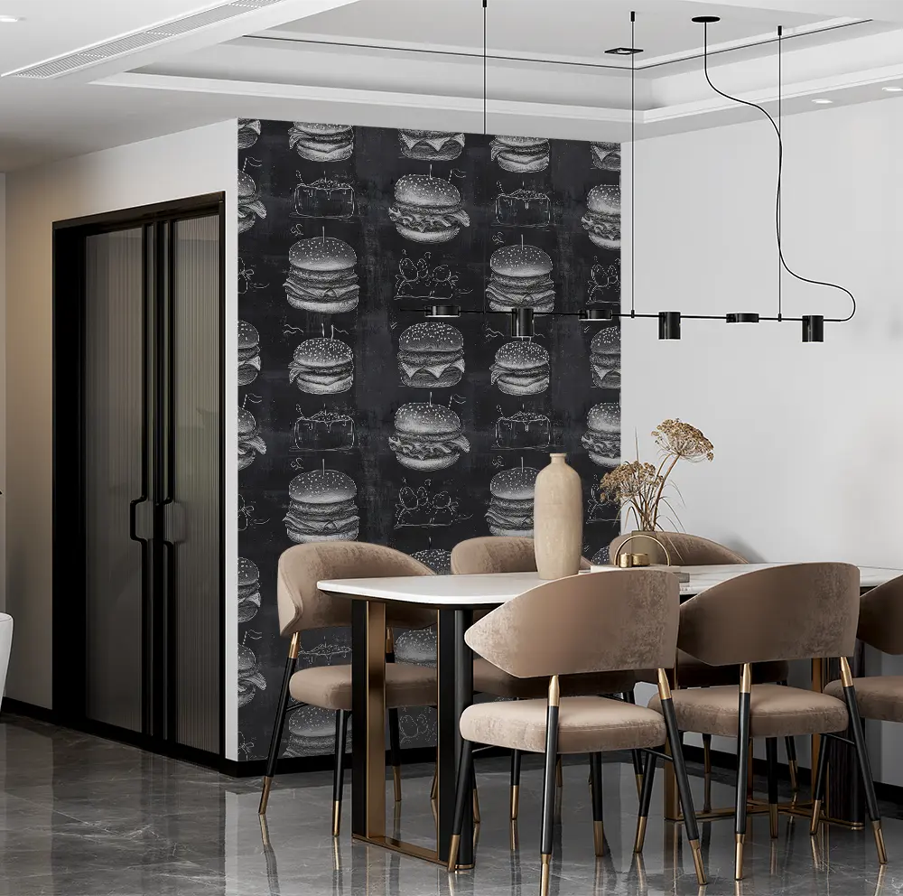 Фототапетът „Черно-бял дизайн с бургери“ е отличен избор за собственици на заведения, които търсят стилен, креативен и запомнящ се интериор с младежки дух и гурме настроение.