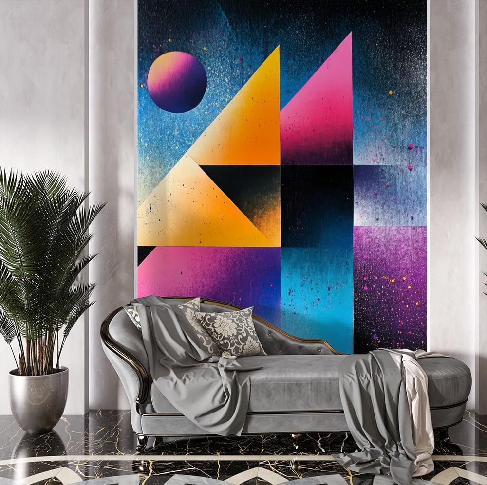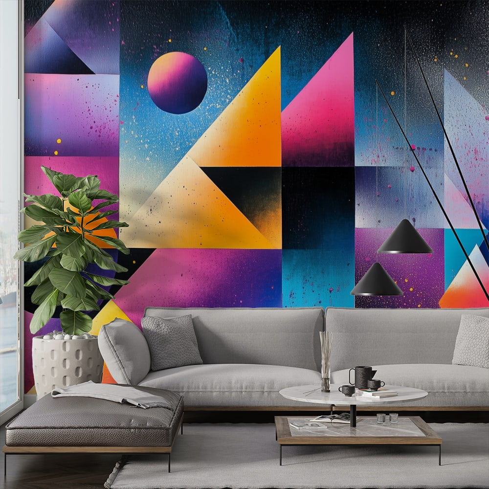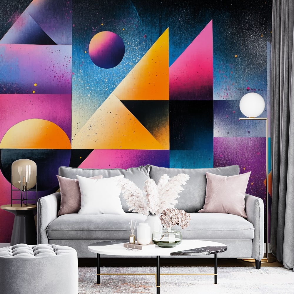 абстрактен фототапет за хол с ярки цветове и геометрични форми в съвременен интериор