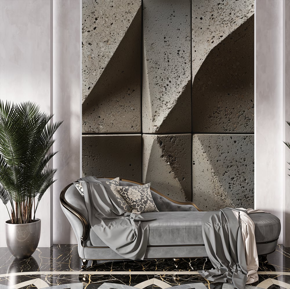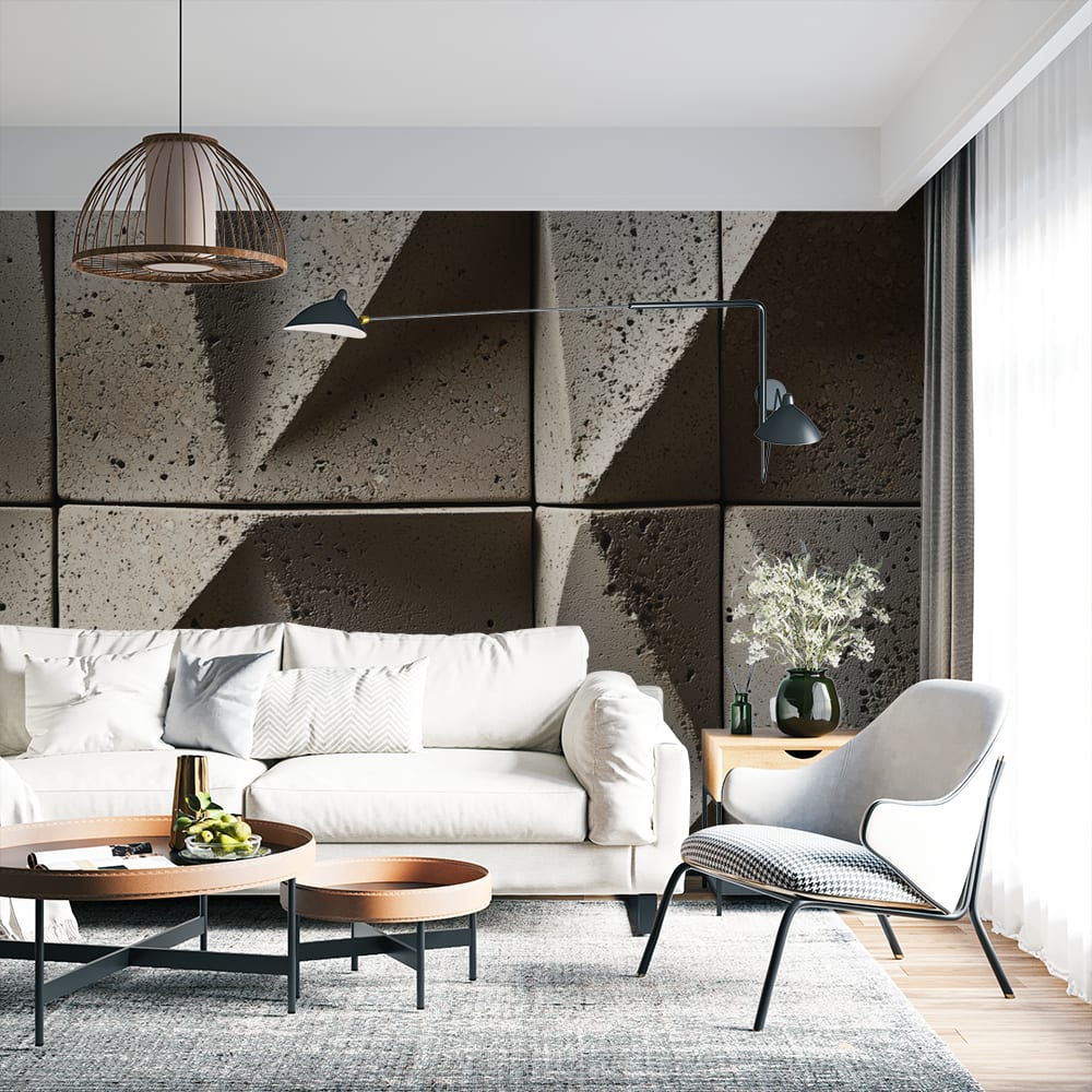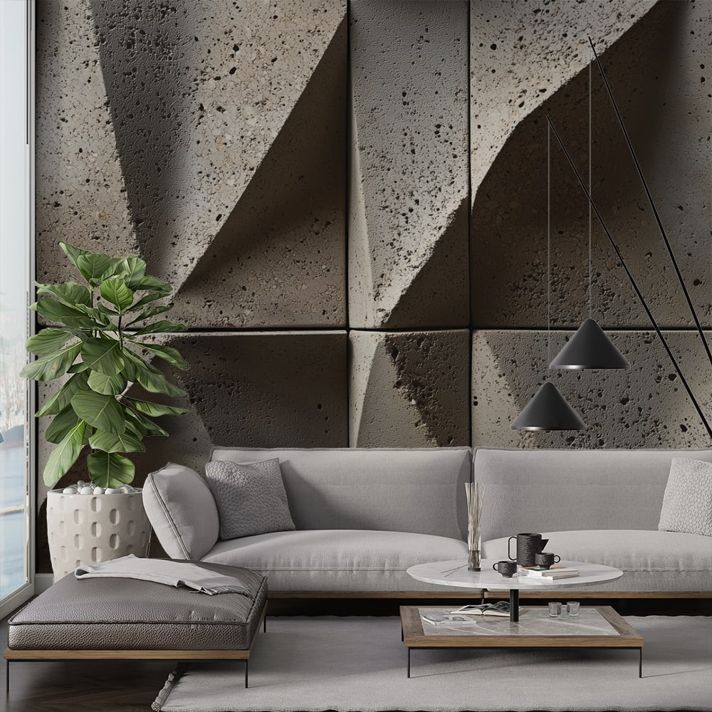 Фототапет бетонна стена 3D ефект в модерен хол с удобен диван и стилен декор.