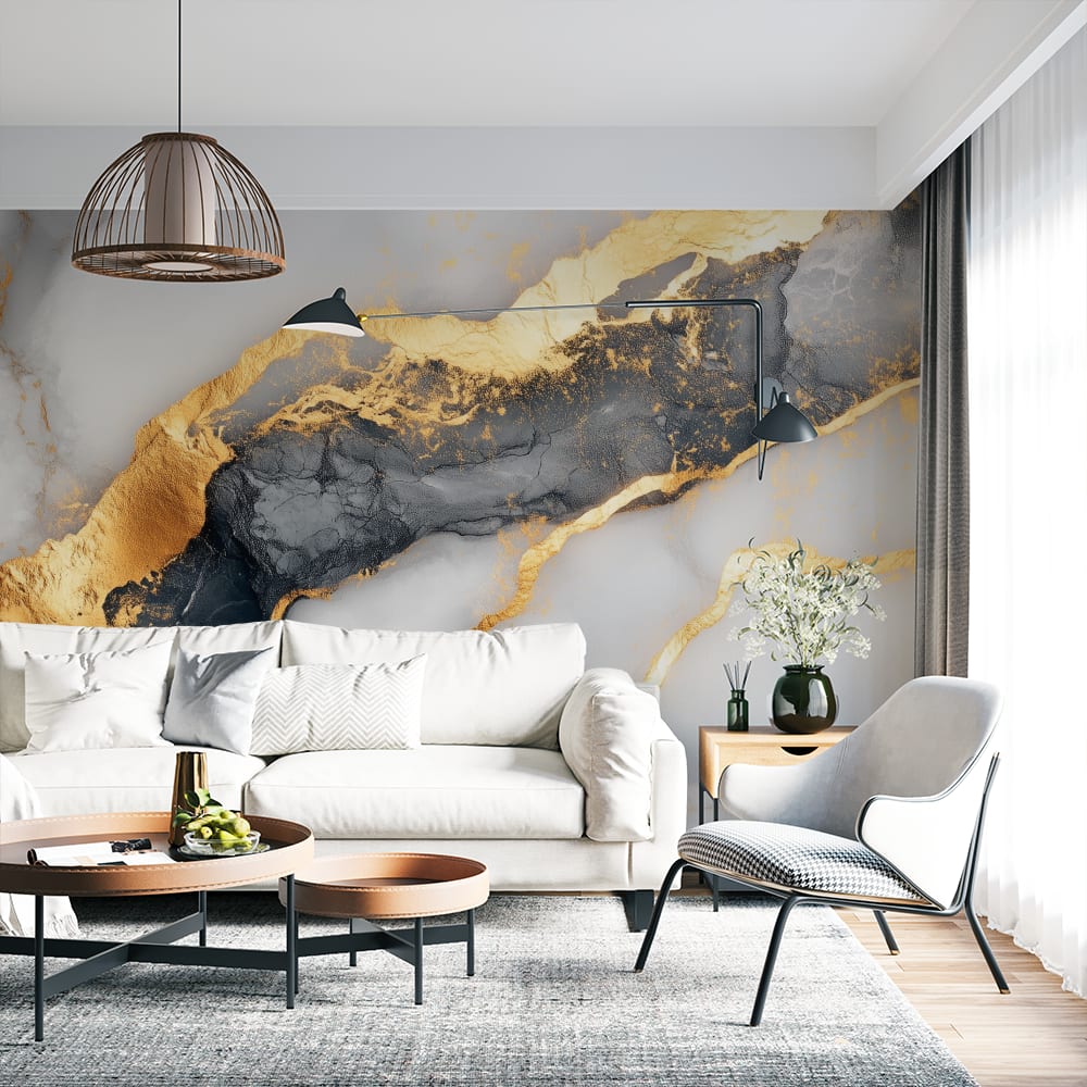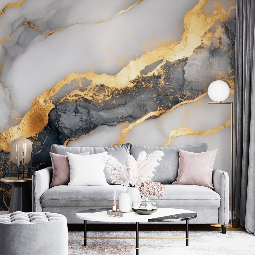 фототапет златни линии сив мрамор в елегантен интериор с диван и масичка