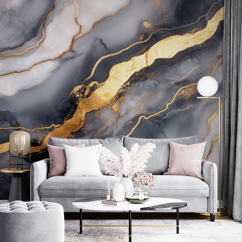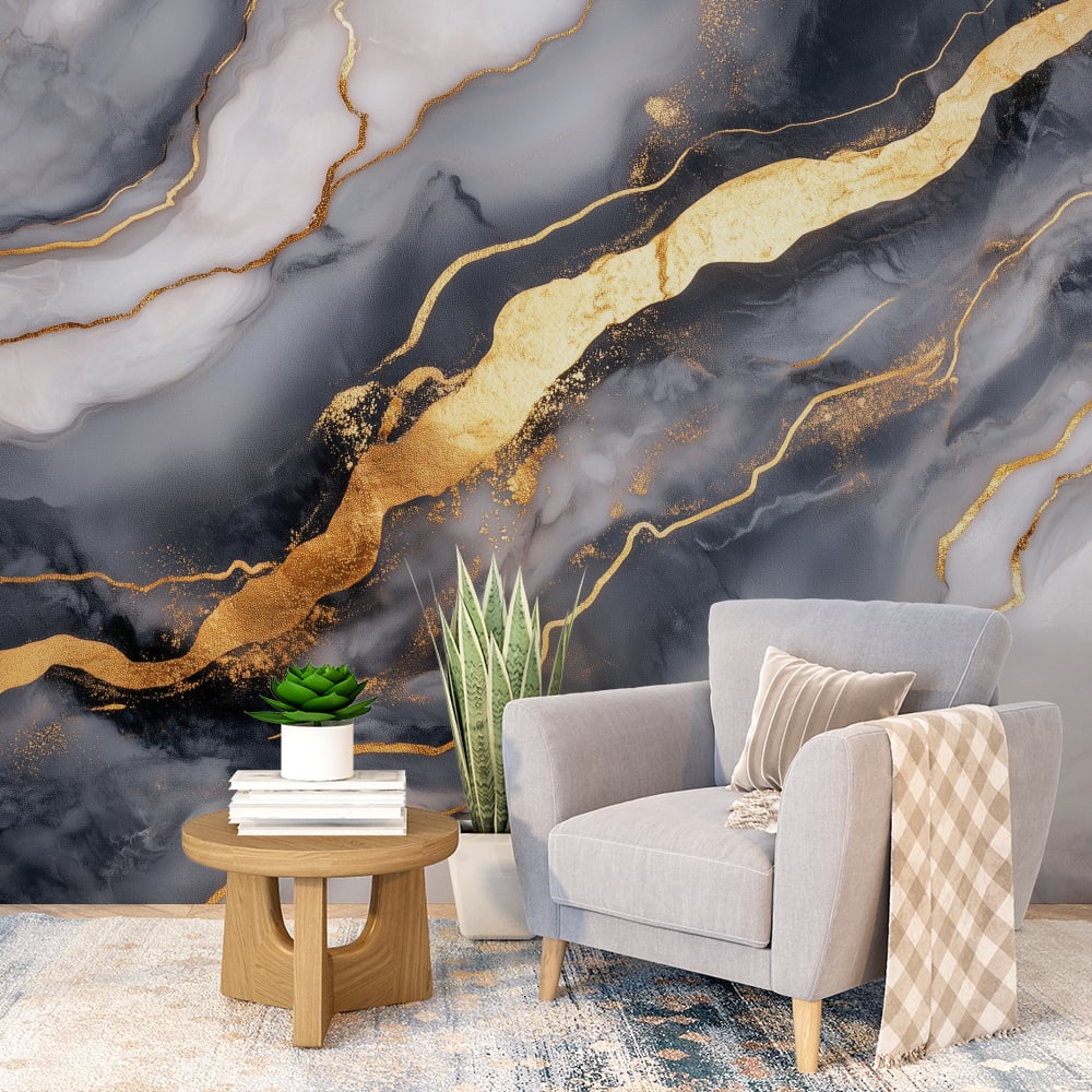 Фототапет златни линии тъмен мрамор - луксозен стенен декор с елегантен дизайн и акценти.