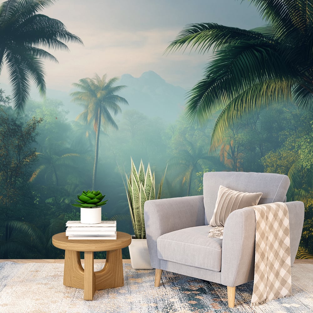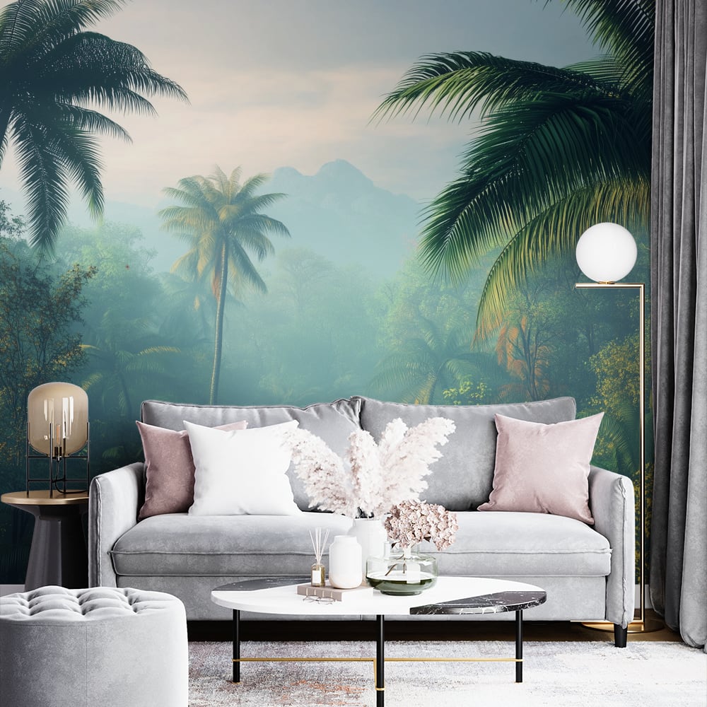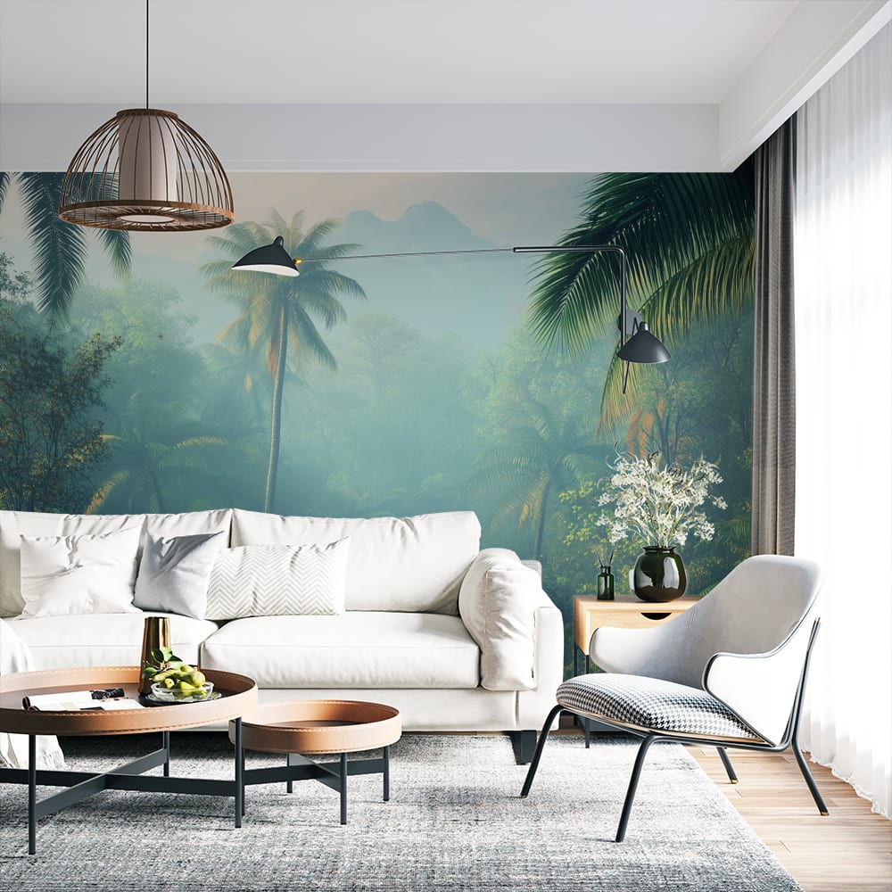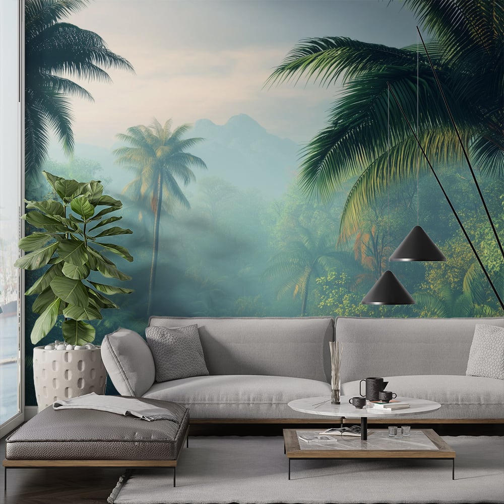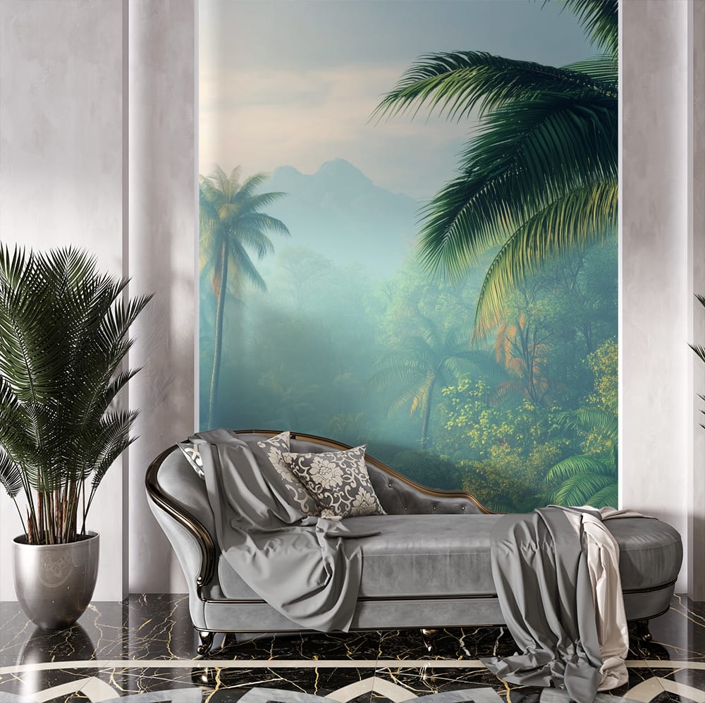 Самозалепващият стенен декор Магическа тропическа джунгла е идеално решение за преобразяване на стаята за 30 минути. Дизайнът включва богата гъста зеленина на палми, мека мъглива перспектива и далечни планински силуети, омагьосващи със свежест и спокойствие, които предизвикват усмивки. Безопасен за деца — отпечатан с HP латексни мастила върху PVC-free еко материал без вредни емисии и без мирис.