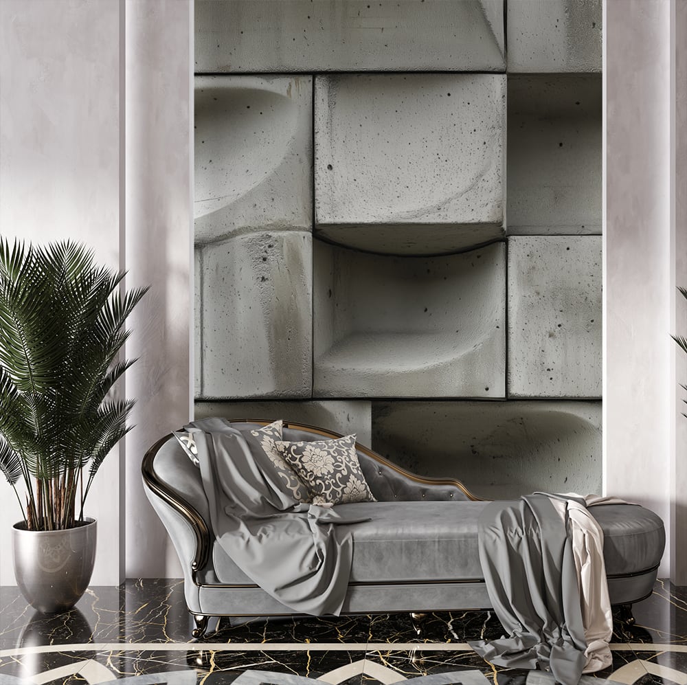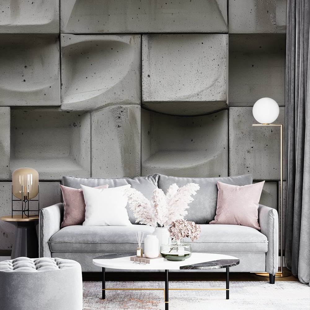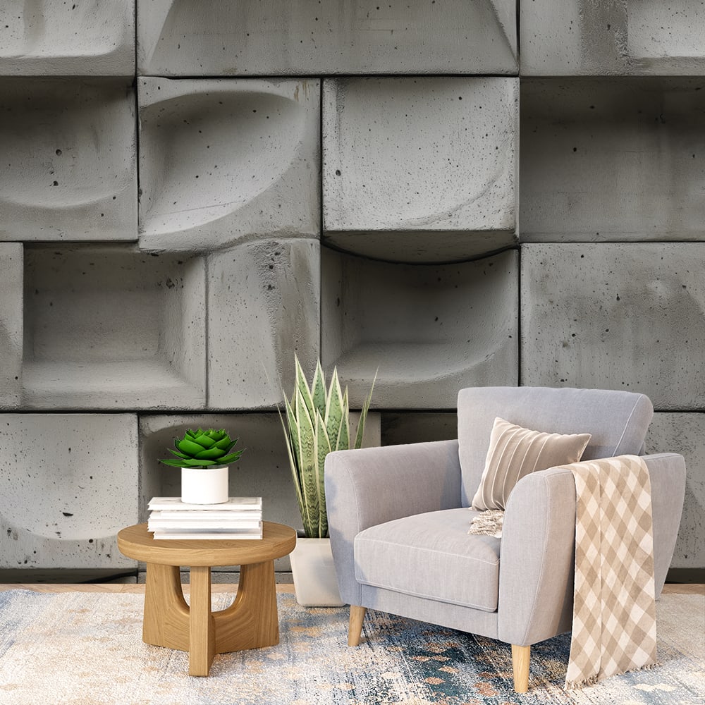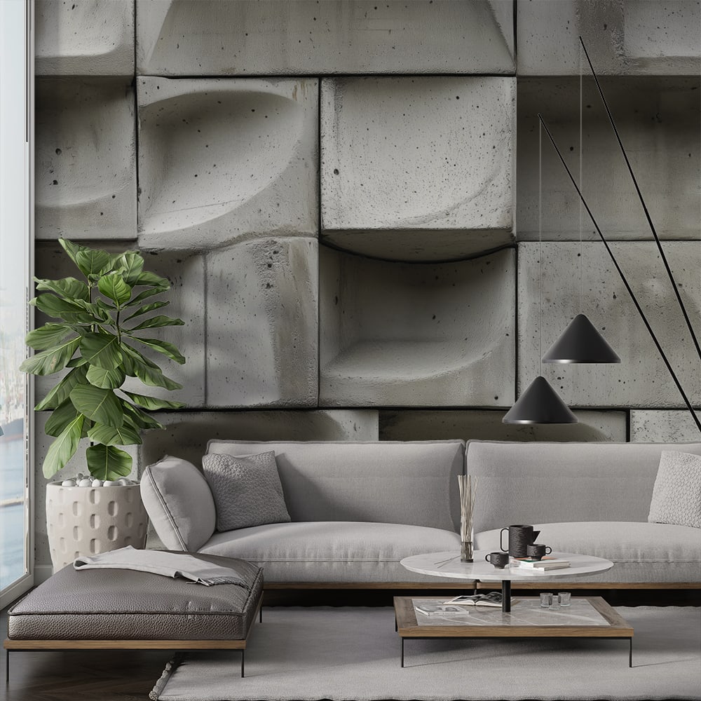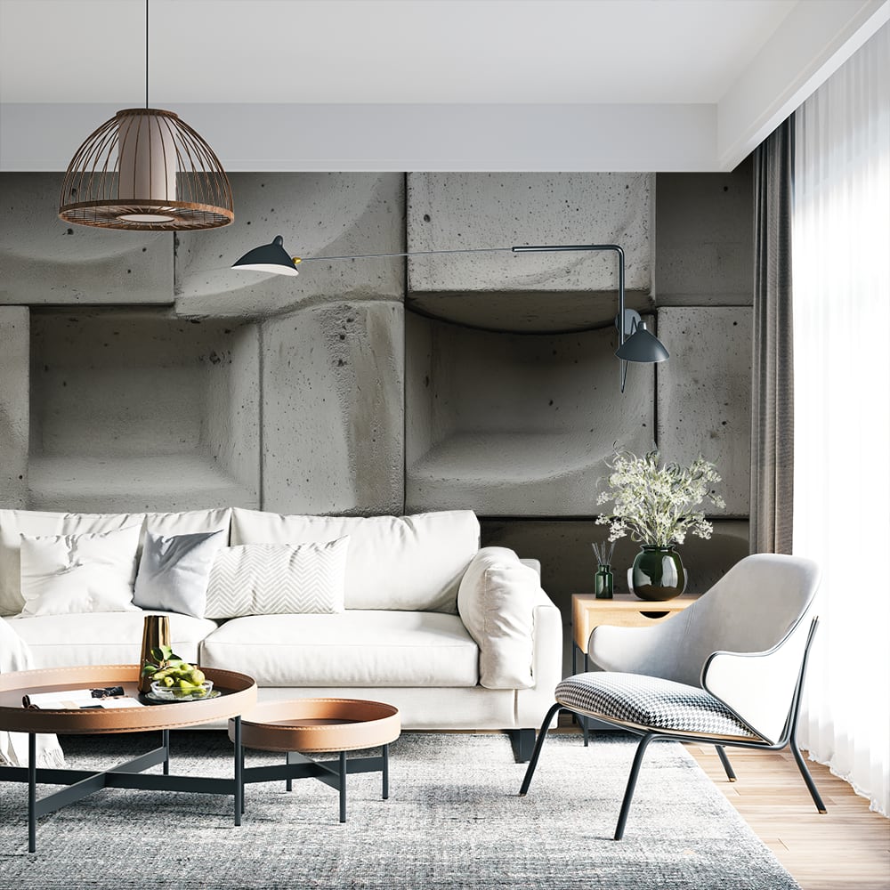 Фототапет модерен бетон с геометричен дизайн в интериор на стая със светъл диван и модерна декорация.