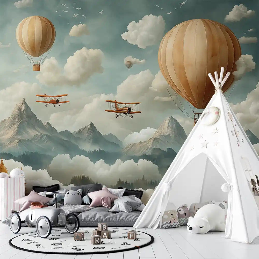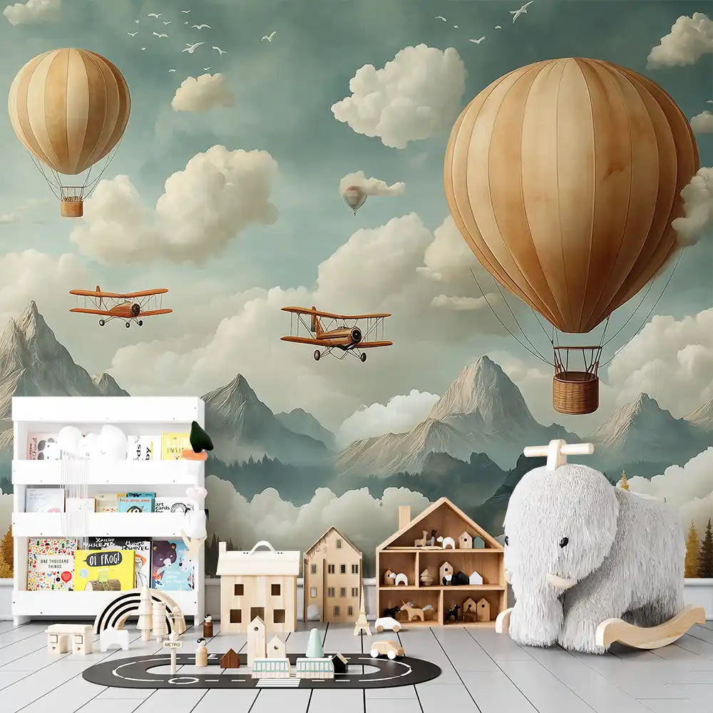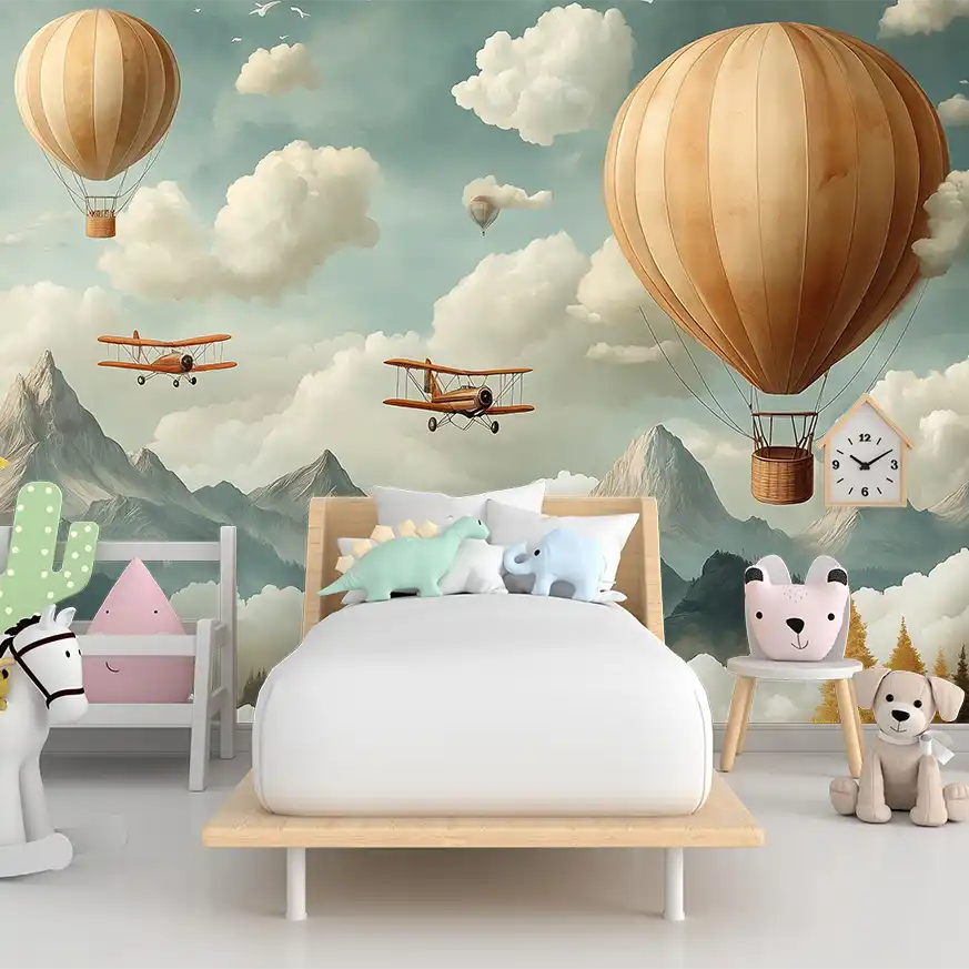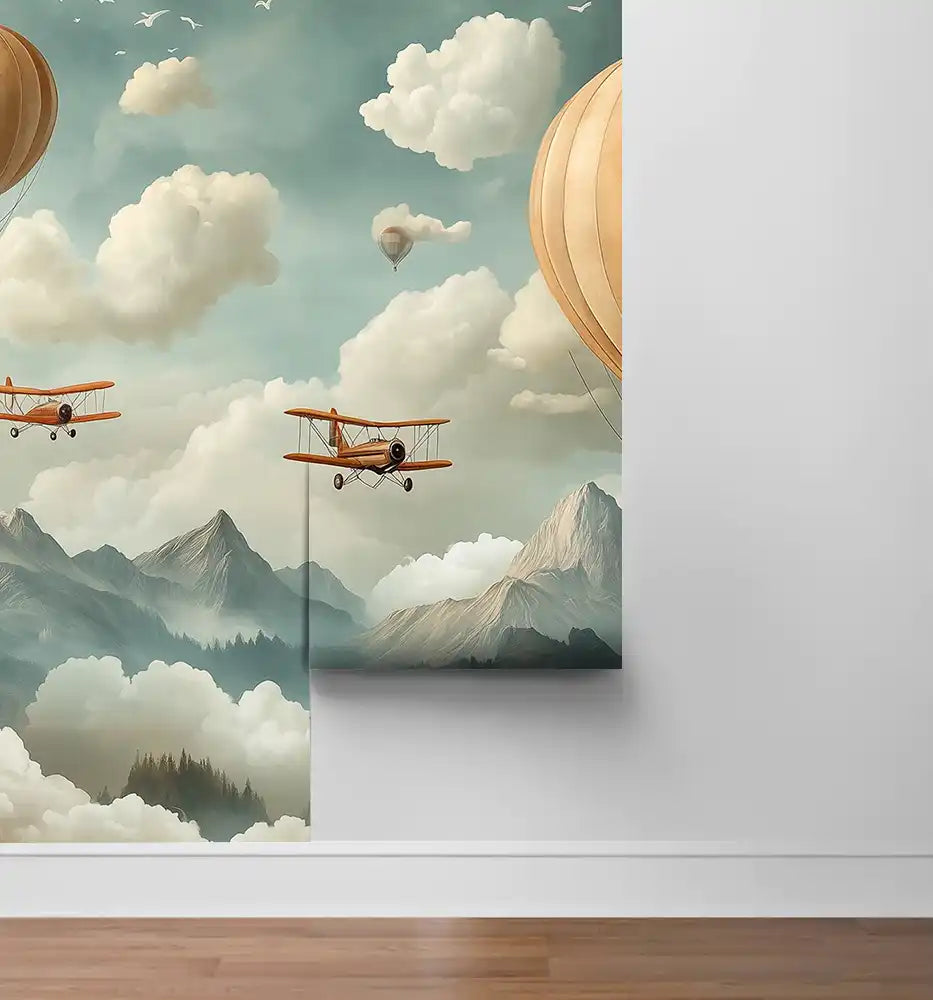 Самозалепващият стенен декор Небесни пътешествия е идеално решение за преобразяване на стаята за 30 минути. Дизайнът включва мечтателно небе с пухкави облаци, винтидж балони и бипланери, носещи вълшебство над величествени планини, които предизвикват усмивки. Безопасен за деца — отпечатан с HP латексни мастила върху PVC-free еко материал без вредни емисии и без мирис.