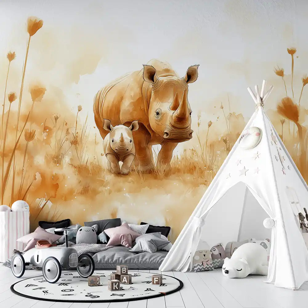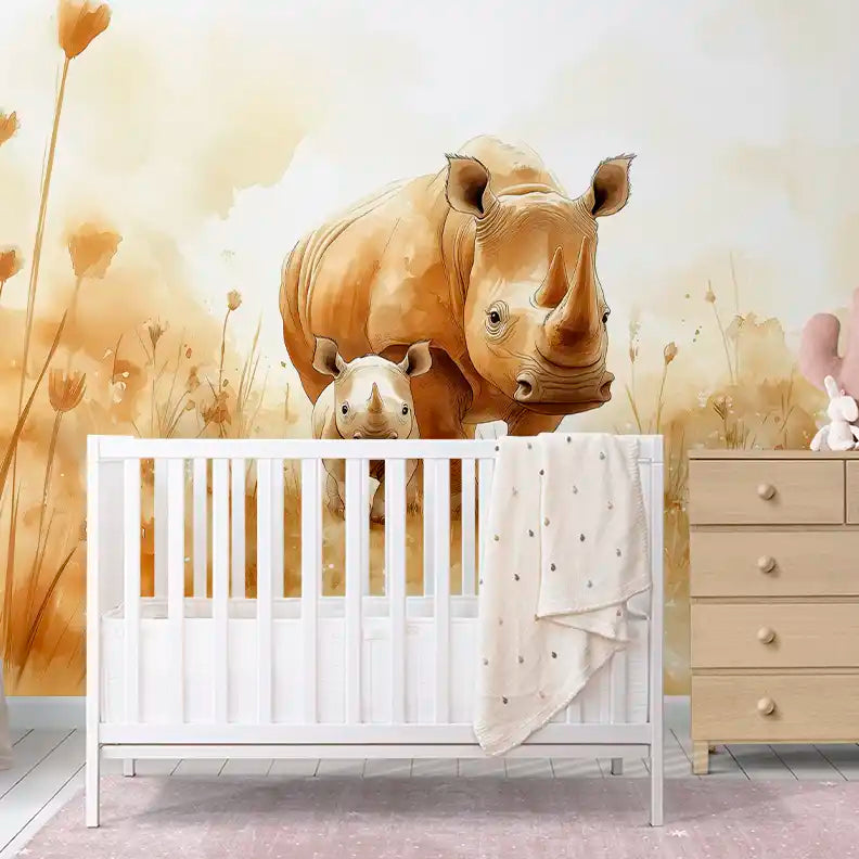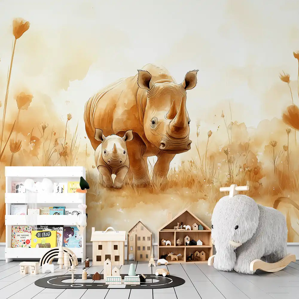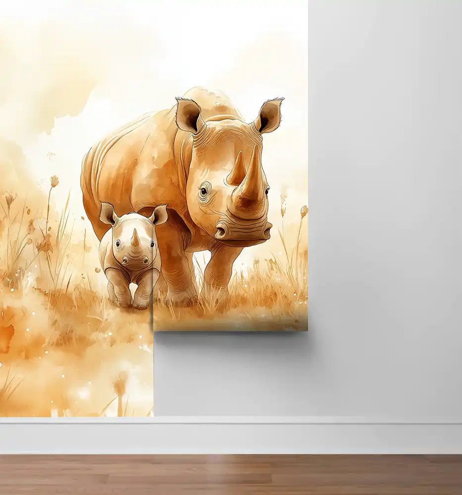Фототапет носорог за детска стая с акварелен портрет на мама носорог и бебе, стилни земни тонове.