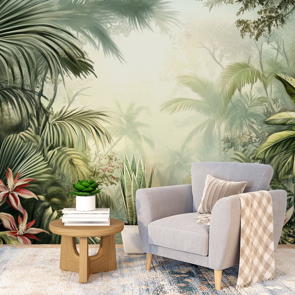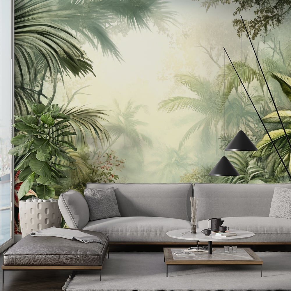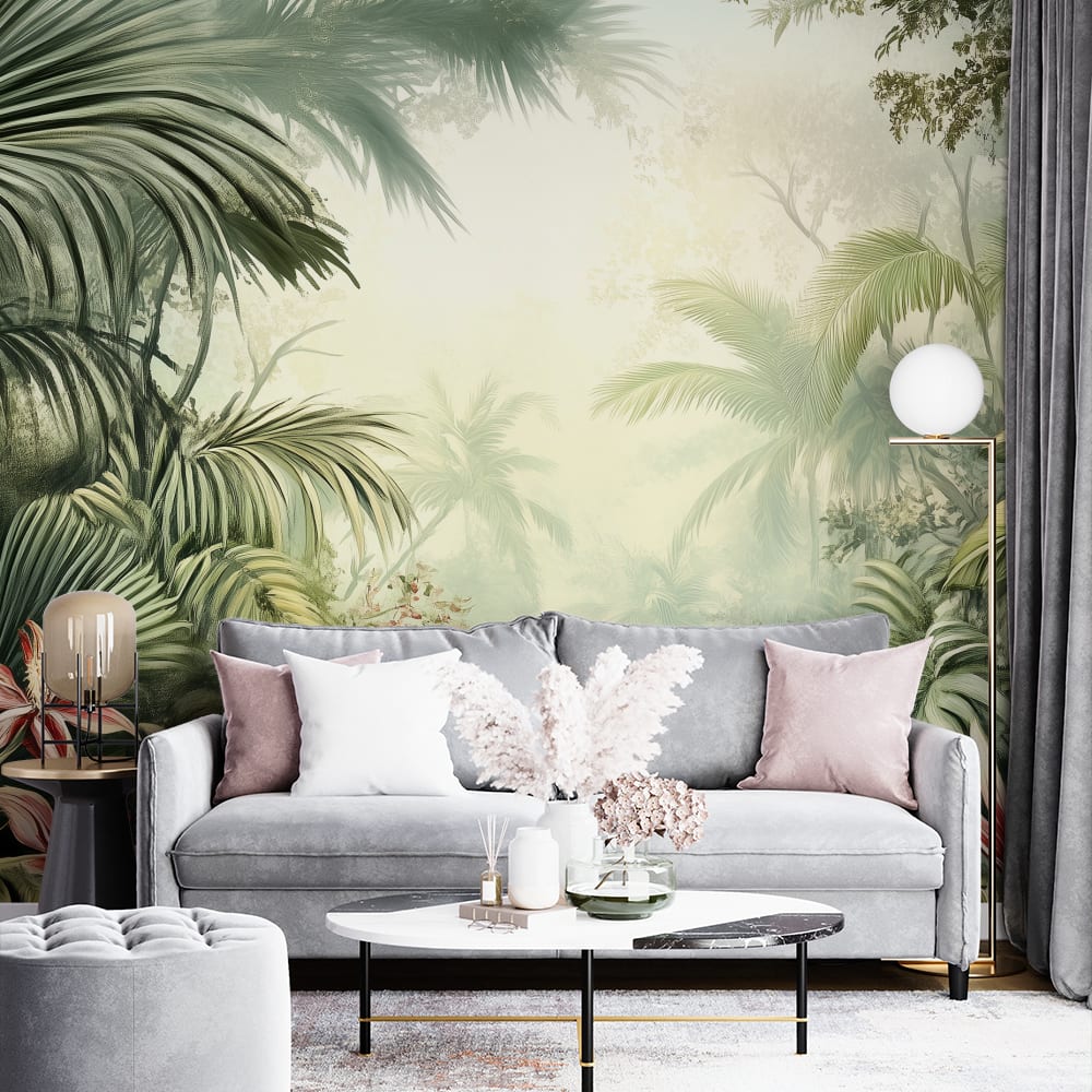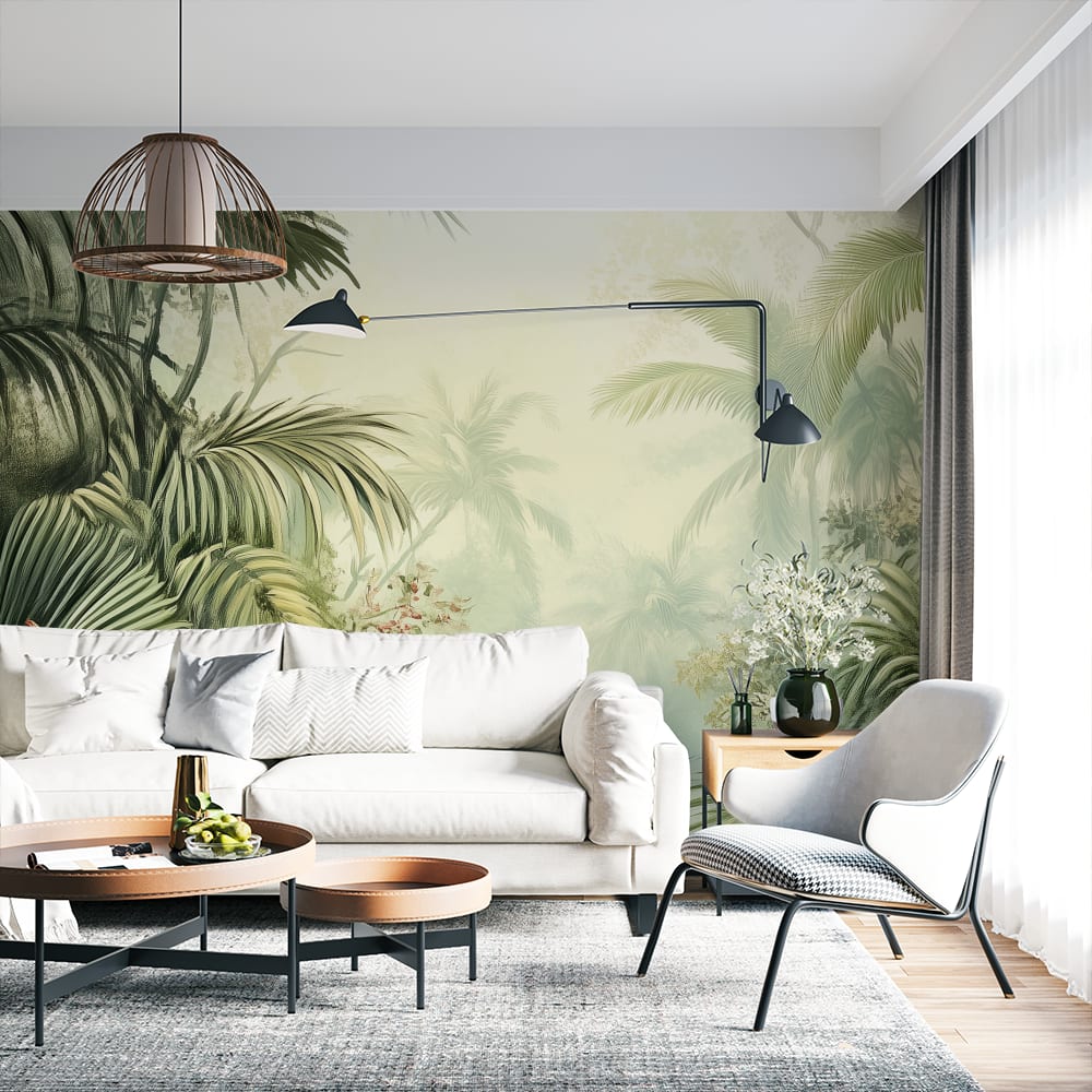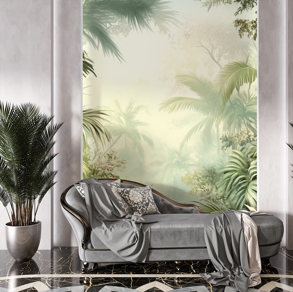 Самозалепващият стенен декор Тропическа джунгла е идеално решение за преобразяване на стаята за 30 минути. Дизайнът включва мъгливи палмови листа и буйна растителност в меки зелени и златисти нюанси, създавайки усещане за спокойствие и приключение, които предизвикват усмивки. Безопасен за деца — отпечатан с HP латексни мастила върху PVC-free еко материал без вредни емисии и без мирис.