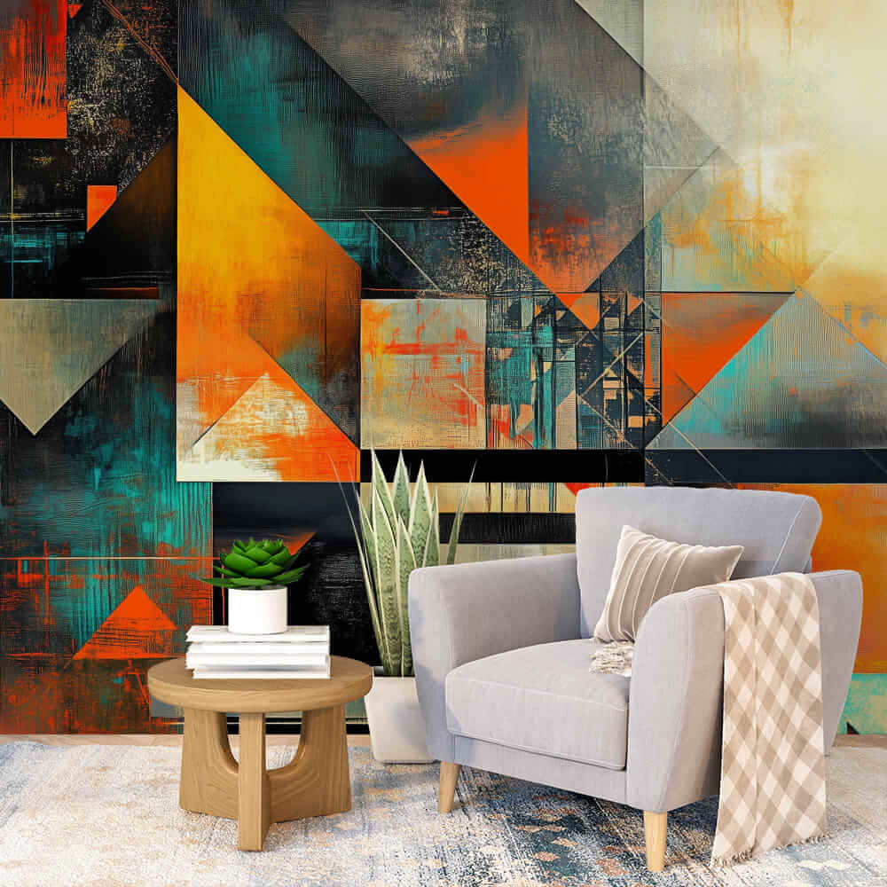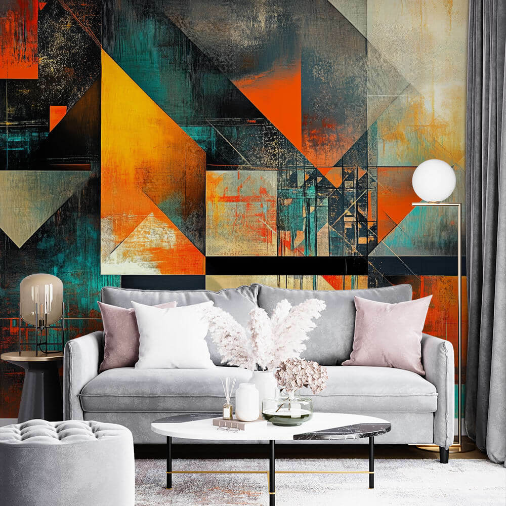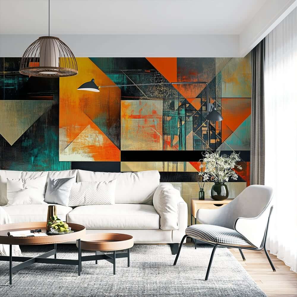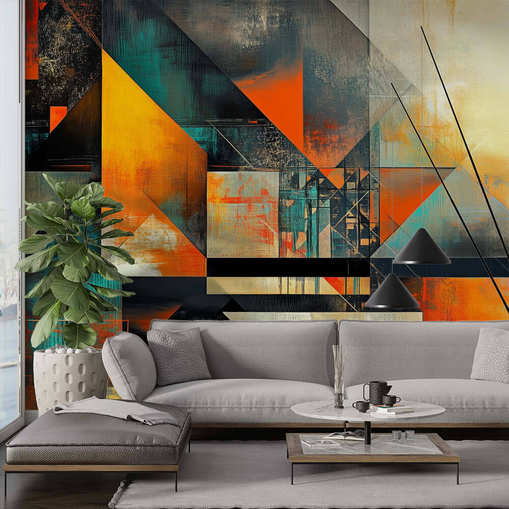 Фототапет Геометричен Ритъм: Оранжев Контраст и Дълбоки Сенки в модерен интериор