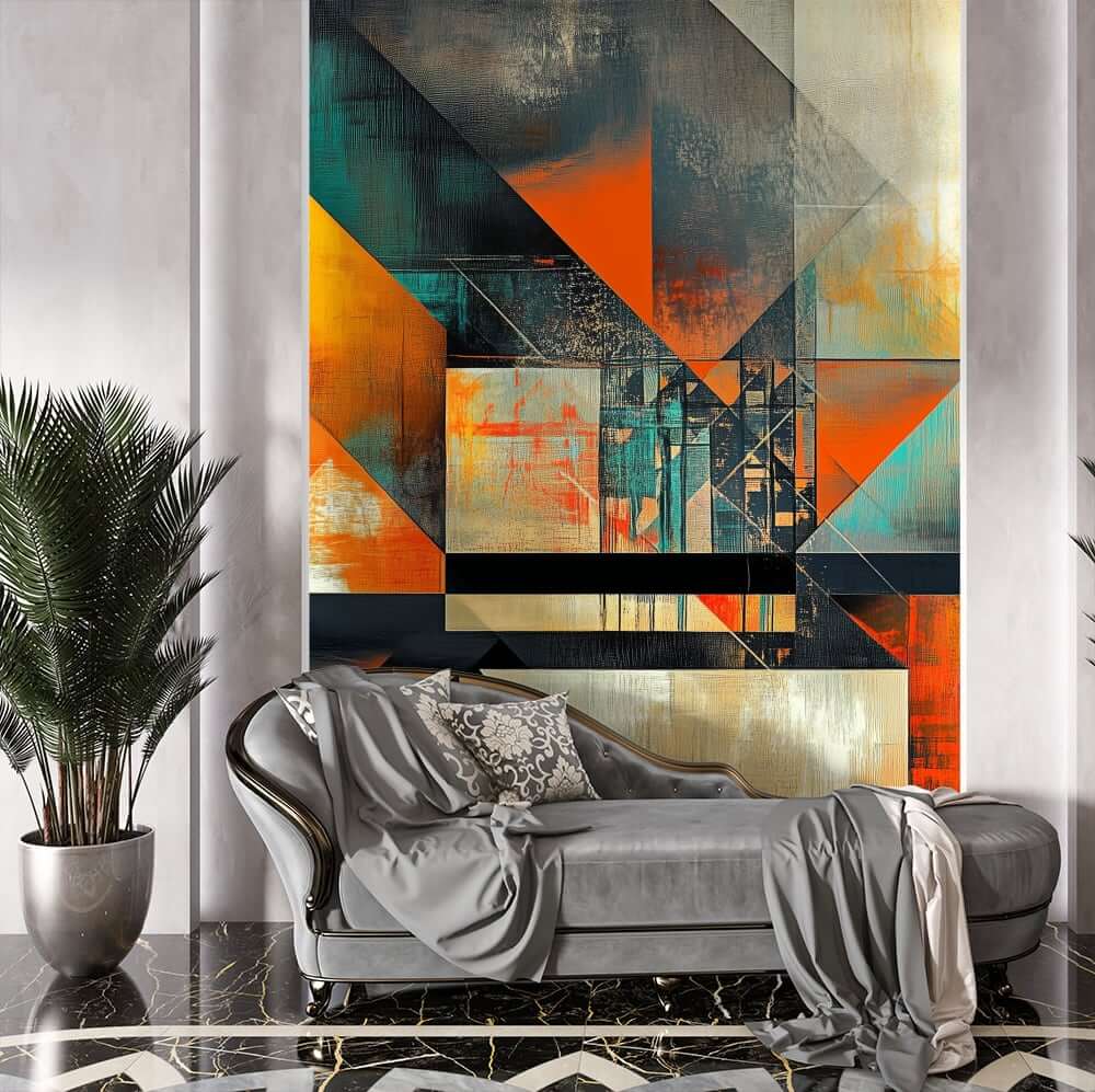 Фототапет Геометричен Ритъм е идеално решение за тези, които искат да преобразят пространството си. Самозалепващият стенен декор фототапет геометричен ритъм в оранжев контраст и дълбоки сенки създава уникална атмосфера в дома или офиса за кратко време. Дизайнът включва атрактивна композиция от остри ъгли и геометрични форми, вдъхновени от съвременни художествени течения. Ярките оранжеви акценти съвършено контрастират с графитени тонове и дълбоки синьо-зелени текстури, придавайки свежест и динамичност на всяко помещение.