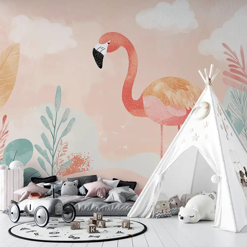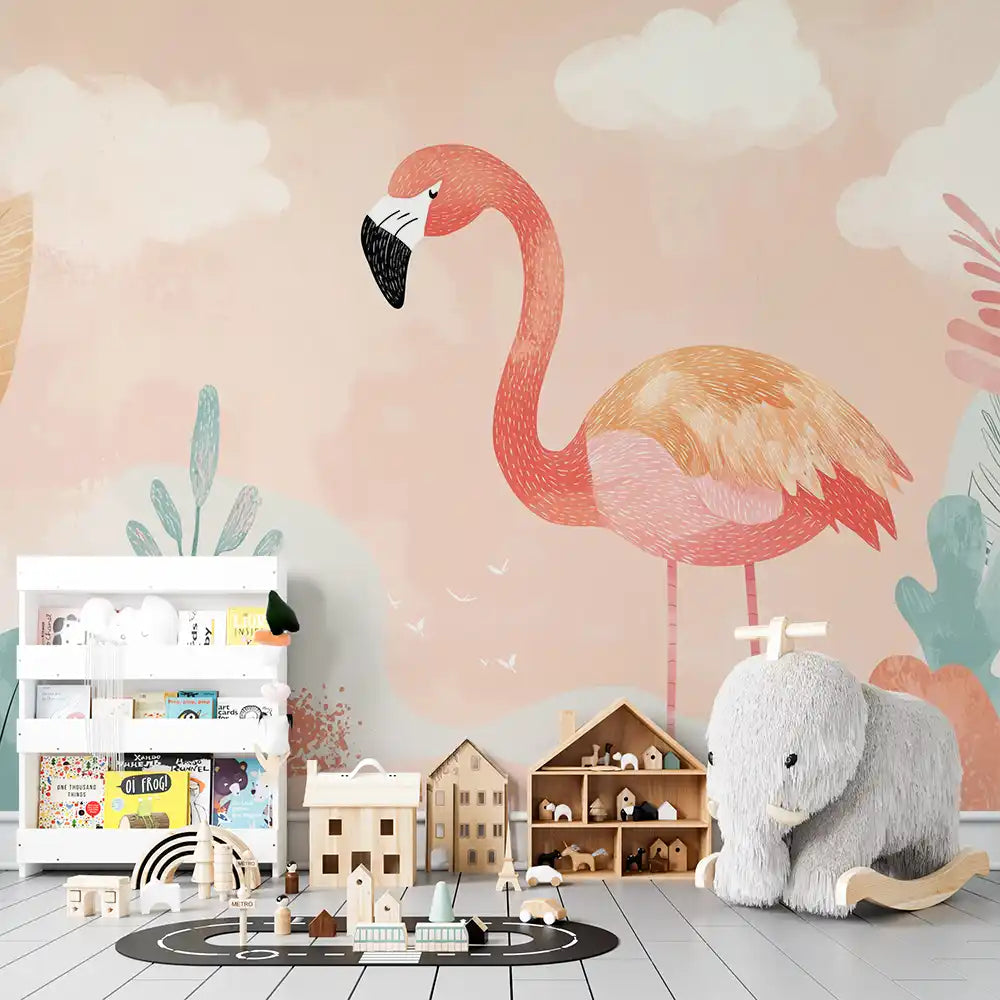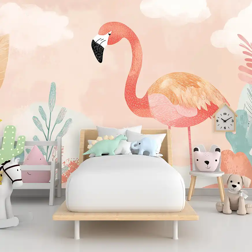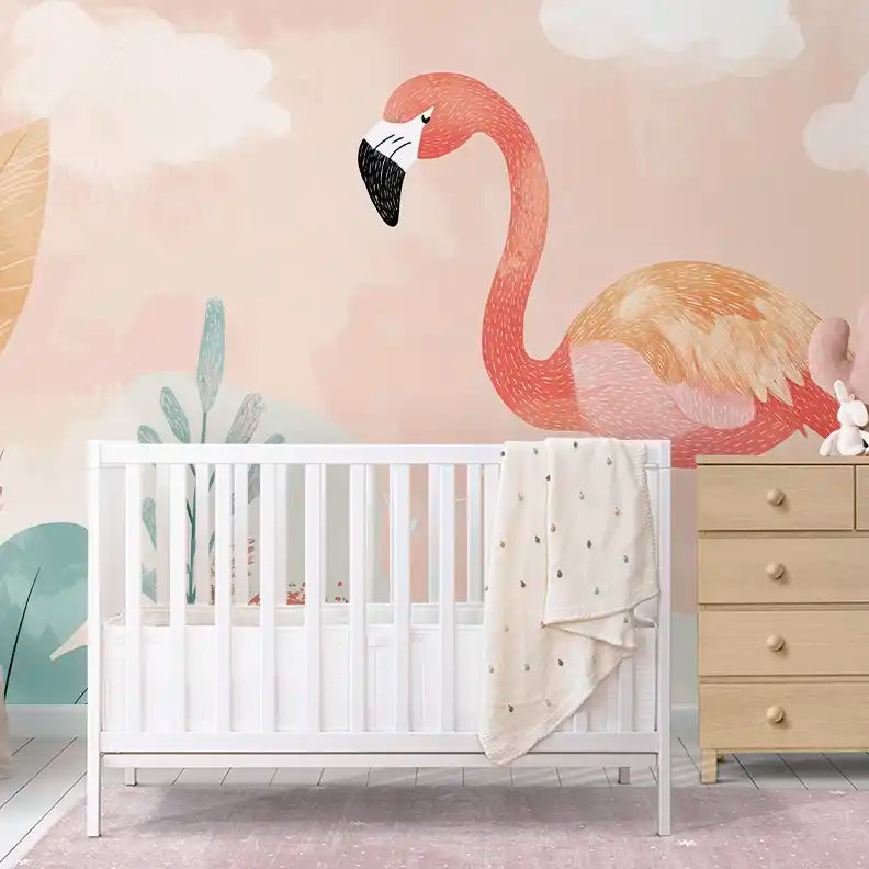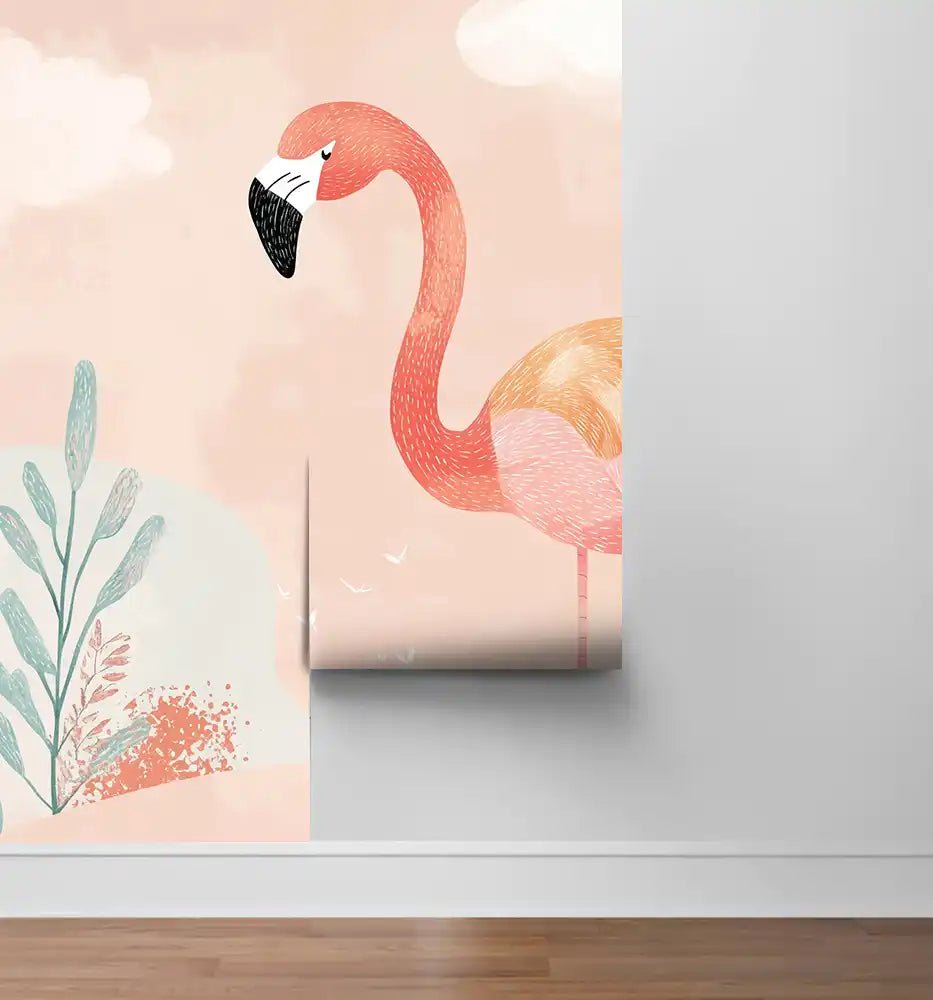Самозалепващият стенен декор Розово фламинго е идеално решение за преобразяване на стаята за 30 минути. Дизайнът включва грациозно розово фламинго сред пухкави облачета и нежни листа, които предизвикват усмивки. Безопасен за деца — отпечатан с HP латексни мастила върху PVC-free еко материал без вредни емисии и без мирис.