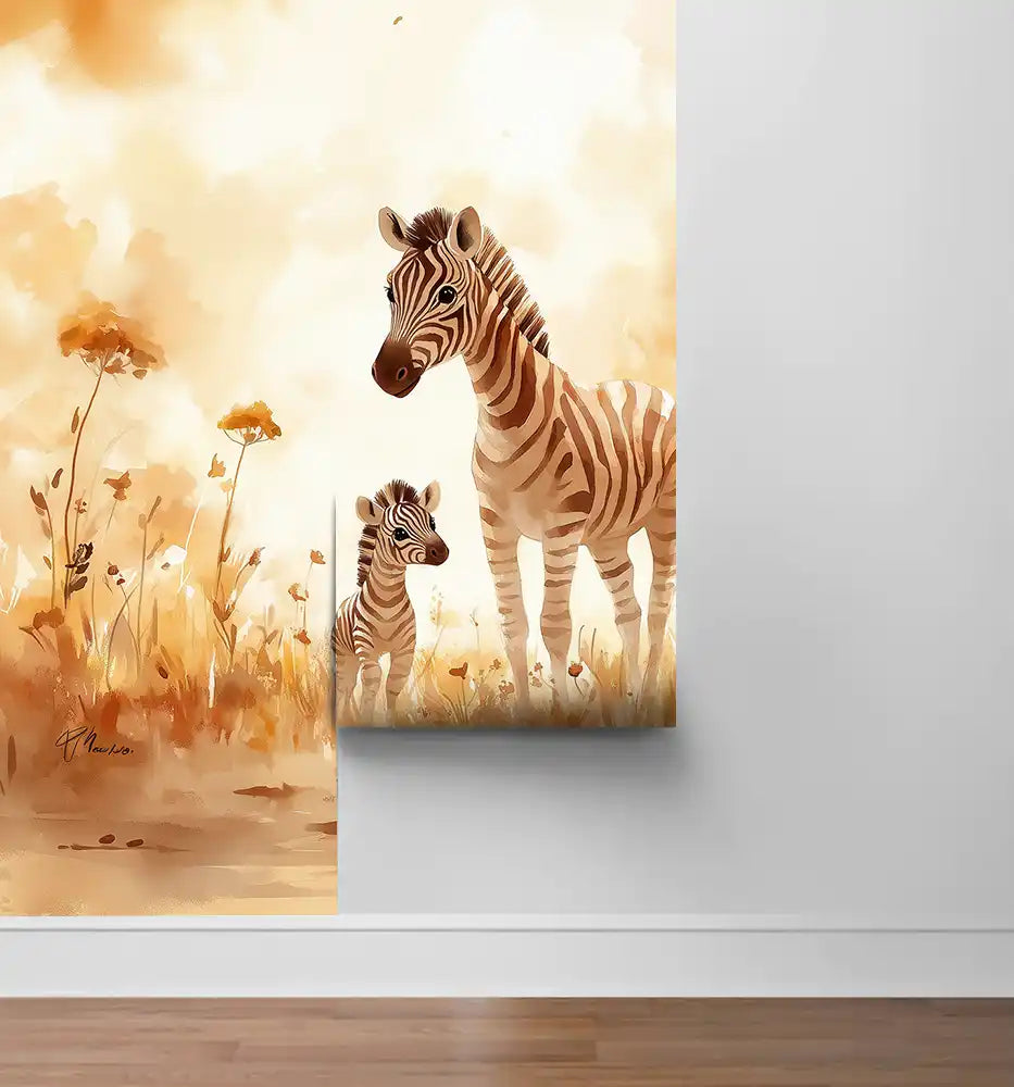 Самозалепващият стенен декор Зебрено семейство е идеално решение за преобразяване на стаята за 30 минути. Дизайнът включва нежна акварелна сцена с майка зебра и нейното малко зебрче, разхождащи се сред златисти цветя, които предизвикват усмивки. Безопасен за деца — отпечатан с HP латексни мастила върху PVC-free еко материал без вредни емисии и без мирис.