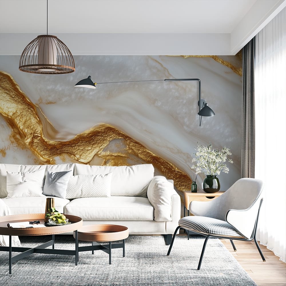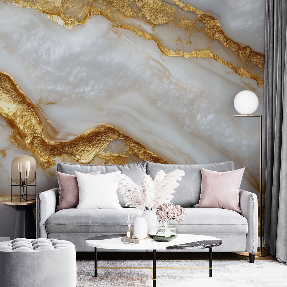 Фототапет Златисти Вени в Мрамор зад диван, акцентиращ елегантността на интериора.