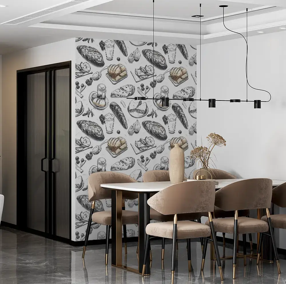 Фототапетът „Арт рисунки с хляб и кроасани“ ще вдъхне живот на всяка пекарна или кафе с неподправен чар и кулинарна естетика, създавайки уютна атмосфера за клиентите.
