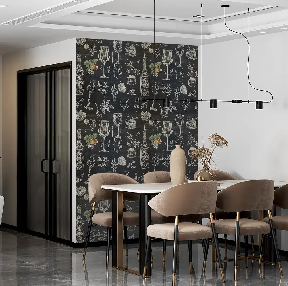 Фототапети за заведения – Арт стил с бутилка вино и билки са перфектен избор за ресторанти, винени барове и кафенета, които искат да създадат уютна и елегантна атмосфера. С артистичен chalkboard дизайн, включващ бутилка вино, чаша, сирене и свежи билки, този фототапет придава характер и кулинарен чар на интериора. Подходящ е за тематични зони, барове, кухни или декоративни акценти в модерни заведения.
