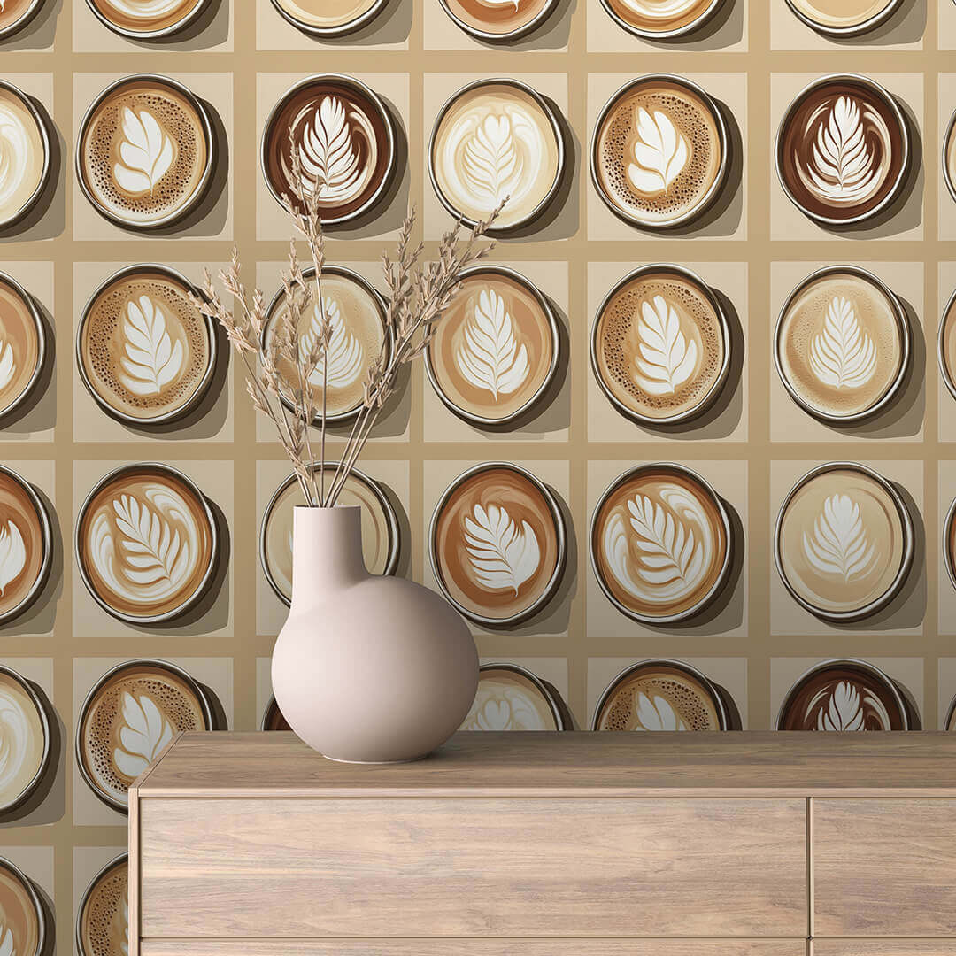 Фототапети за заведения – Кафе арт дизайн с лате рисунки са идеалният избор за кафенета, барове и сладкарници, които искат да внесат уют и топлина в интериора си. Дизайнът представя редици от чаши кафе с лате арт рисунки в нежни бежови тонове, създавайки усещане за аромат, комфорт и стил. Перфектен за стени зад бар плот, кътове за почивка или уютни зони в модерни заведения.
