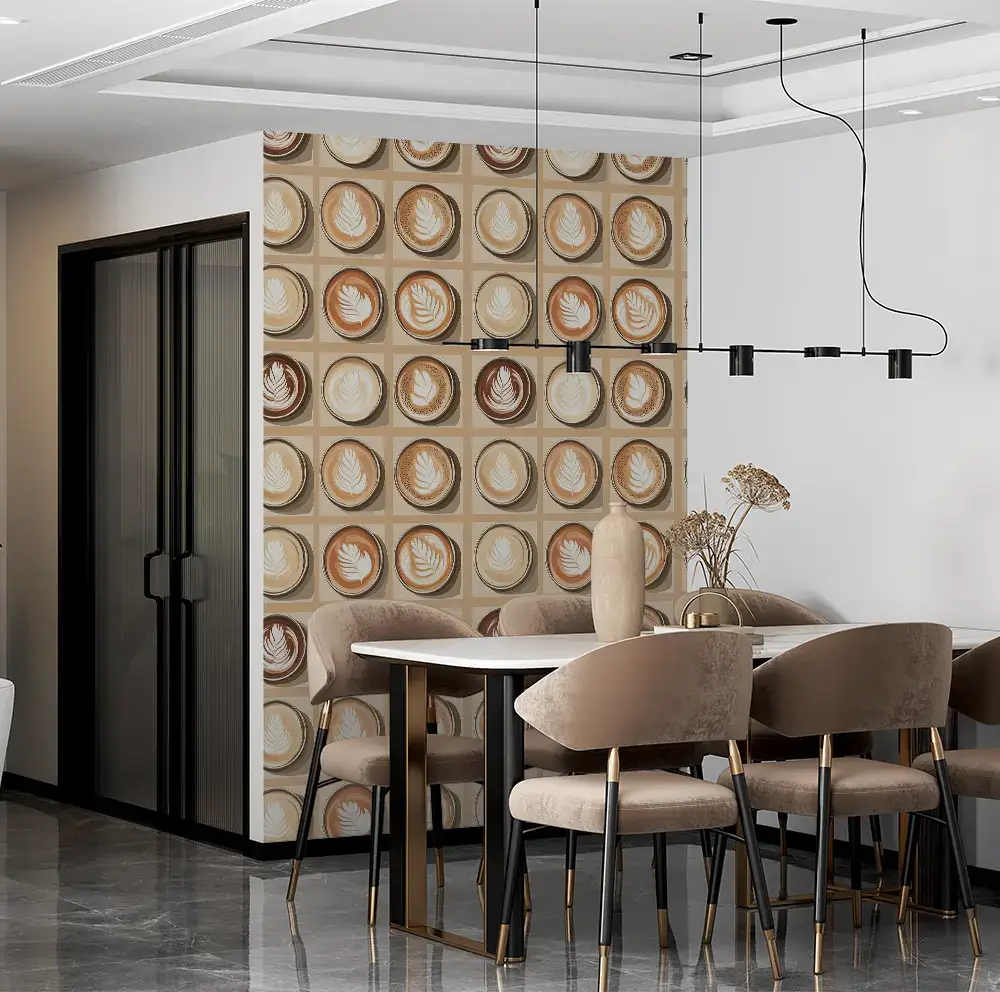 Фототапетът „Кафе арт дизайн с лате рисунки“ е чудесен избор за всяко заведение, което иска да създаде топла атмосфера и да подчертае любовта към кафето чрез стилен и модерен дизайн.