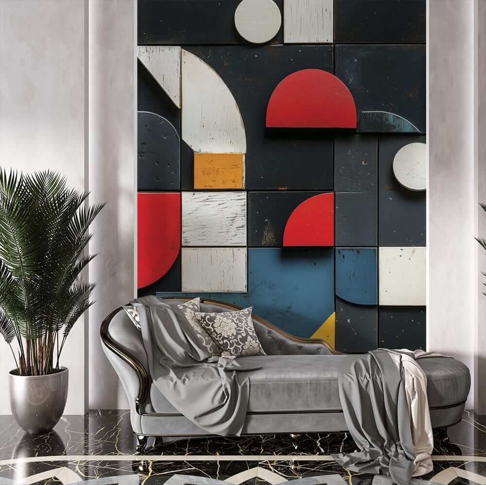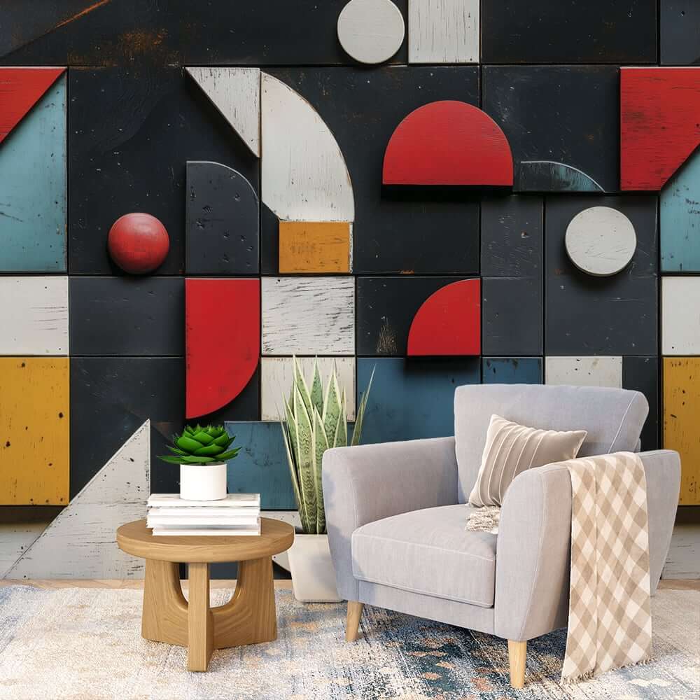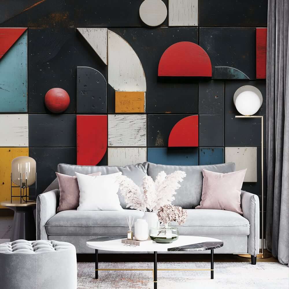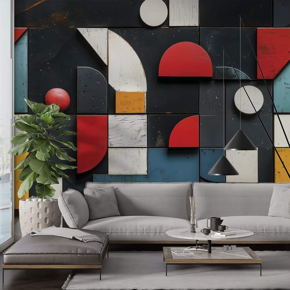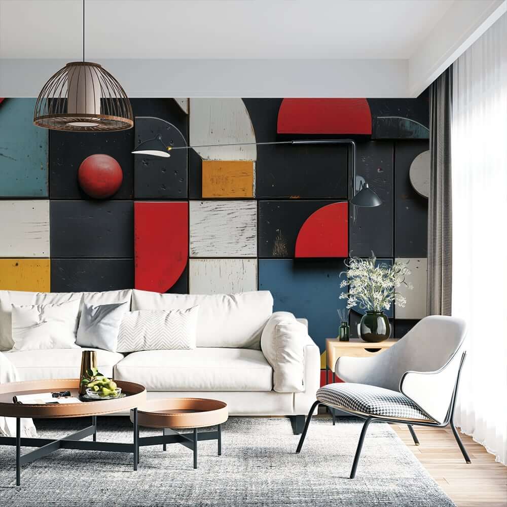 геометричен фототапет за хол с абстрактни форми и ярки цветове на стената зад модерна мебел