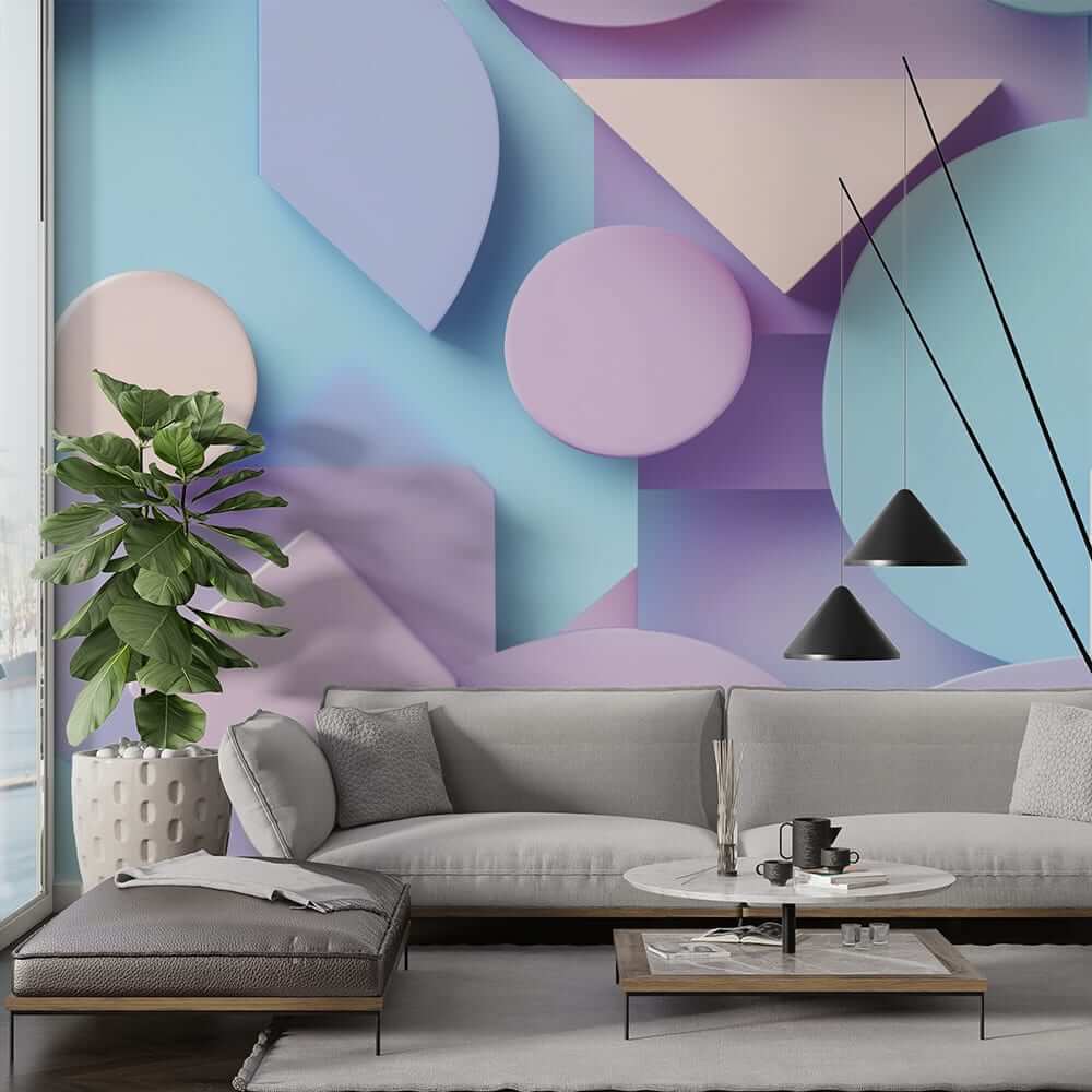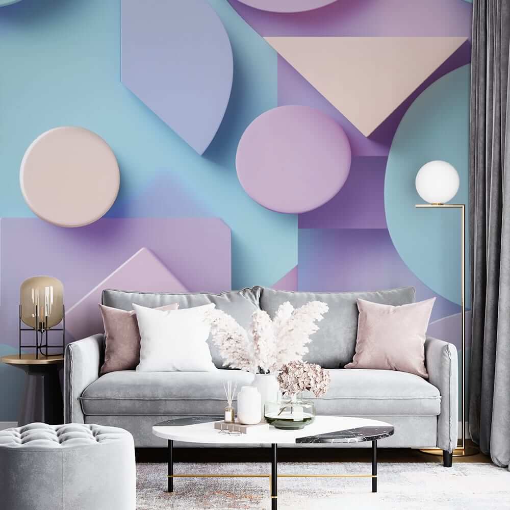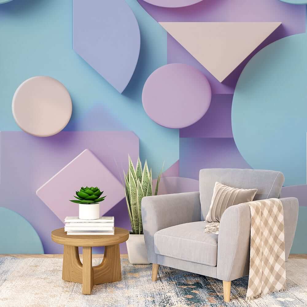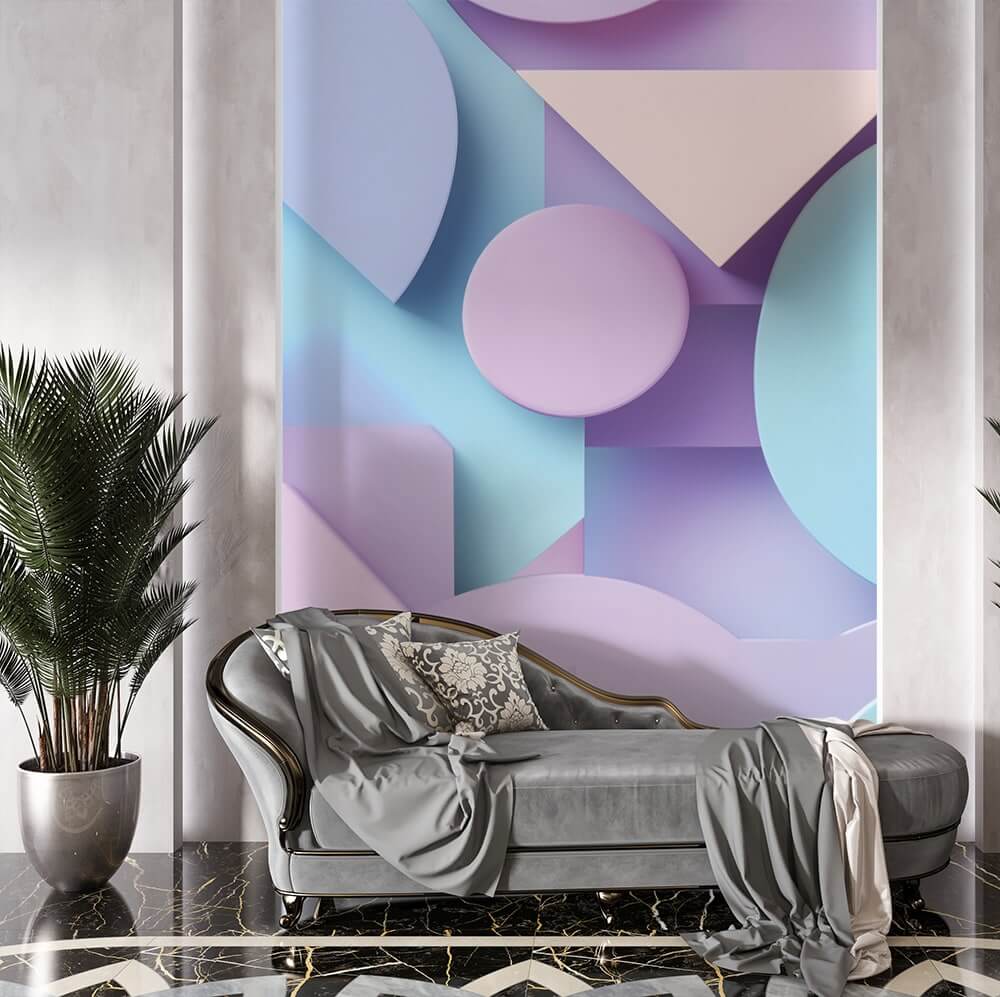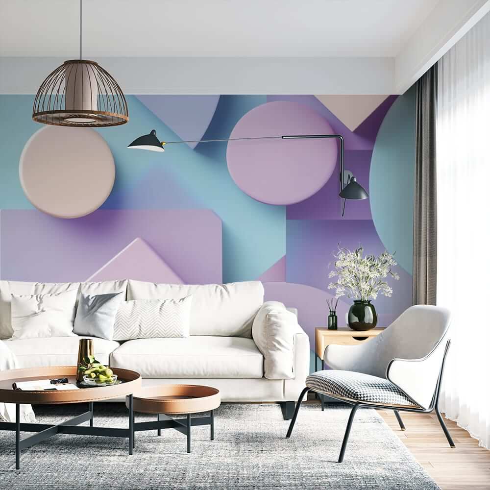 Геометрични фототапети за хол предоставят уникален начин за преобразяване на вашето пространство. Самозалепващият стенен декор [Геометрични форми] е идеално решение за модерно оформление, позволяващо на всеки да създаде елегантна и съвременна атмосфера в своя дом. Дизайнът включва [нежни акварелни геометрични форми в нюанси на синьо и лилаво], които предизвикват усмивки и спокойствие. Използваните материали са безопасни за деца — отпечатани с HP латексни мастила, те са направени върху PVC-free еко материал, който не отделя вредни емисии и е без мирис.